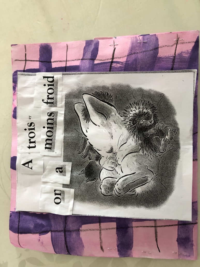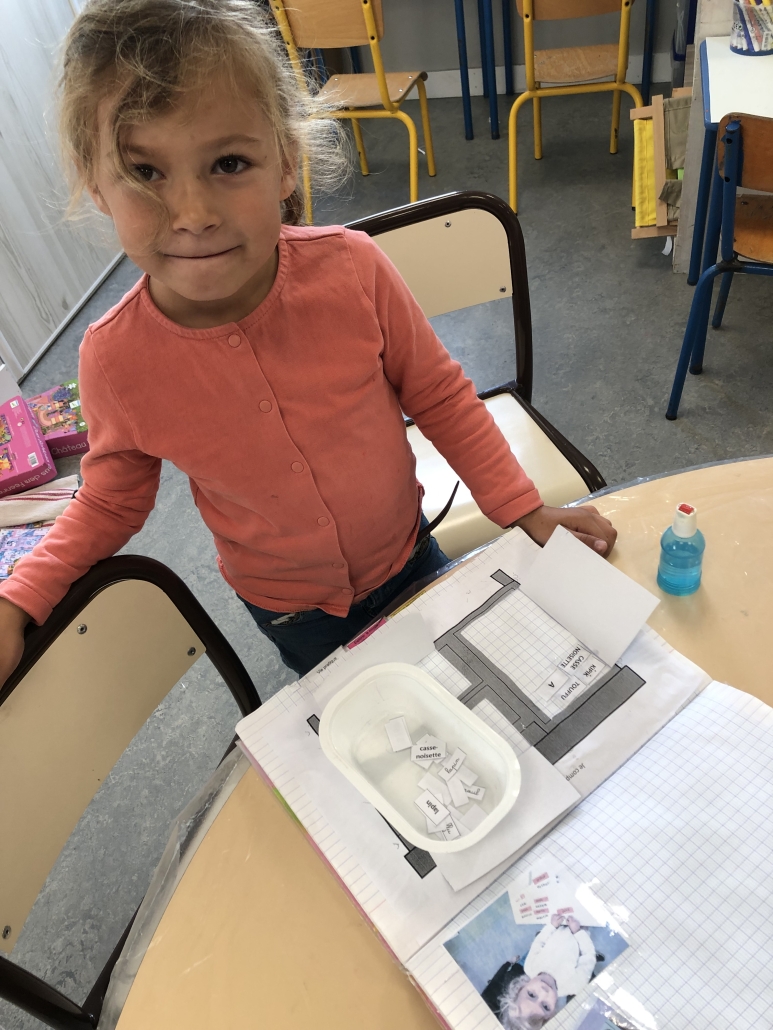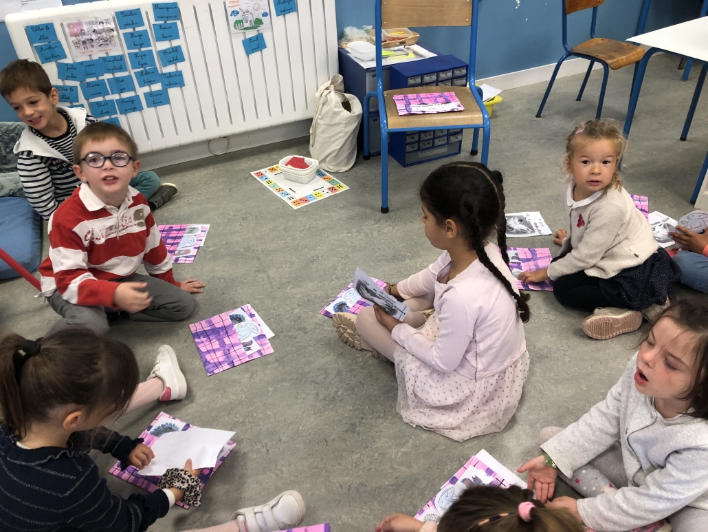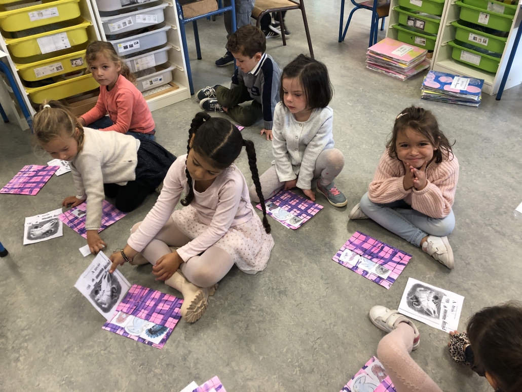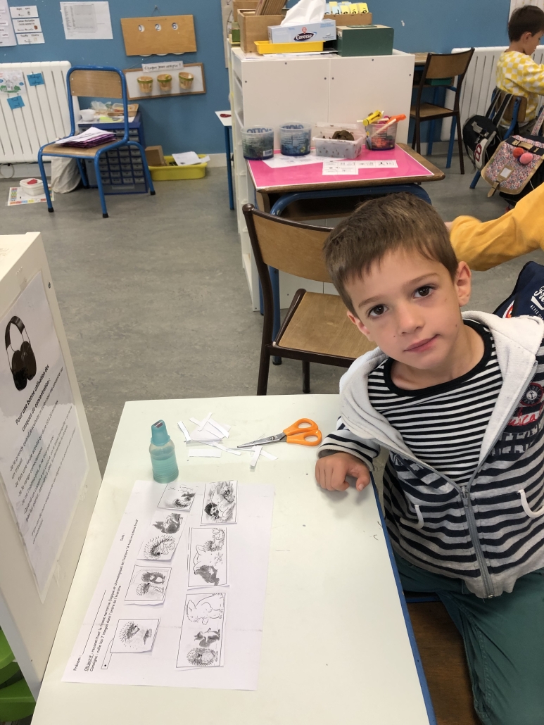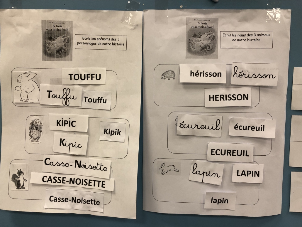 Ils ont reproduit la couverture de Kipik le hérisson en graphisme. Puis ils manipulé les noms des personnages dans les 3 écritures et se sont entraîné à raconter l’histoire grâce à cette « couverture-pochette. » Un régal de langage oral pour se mettre en confiance en début d’année.