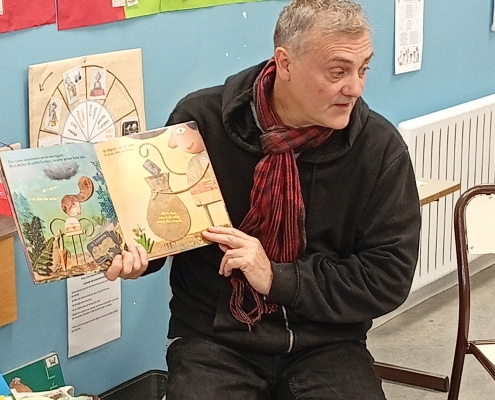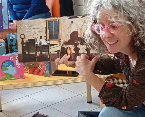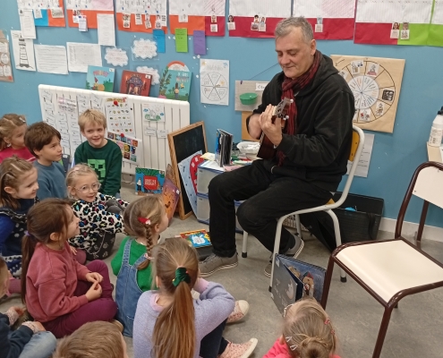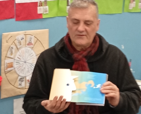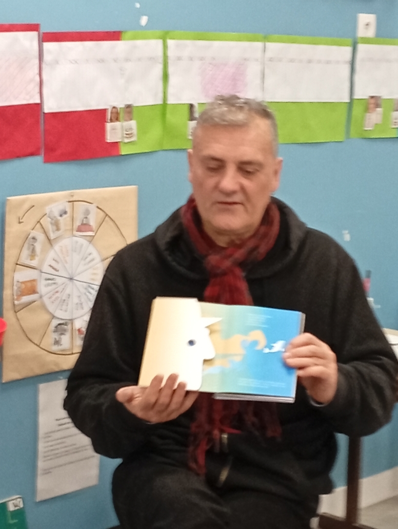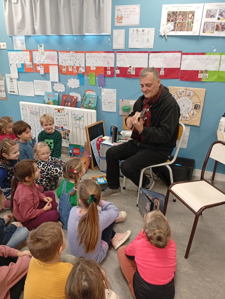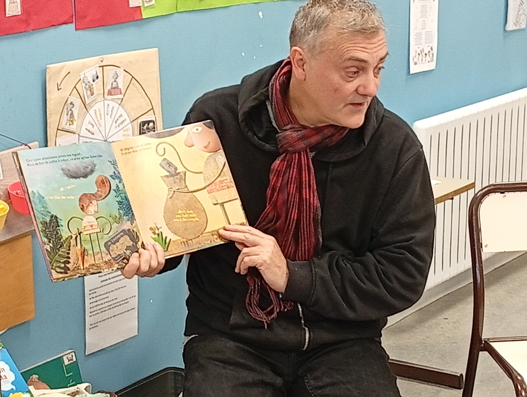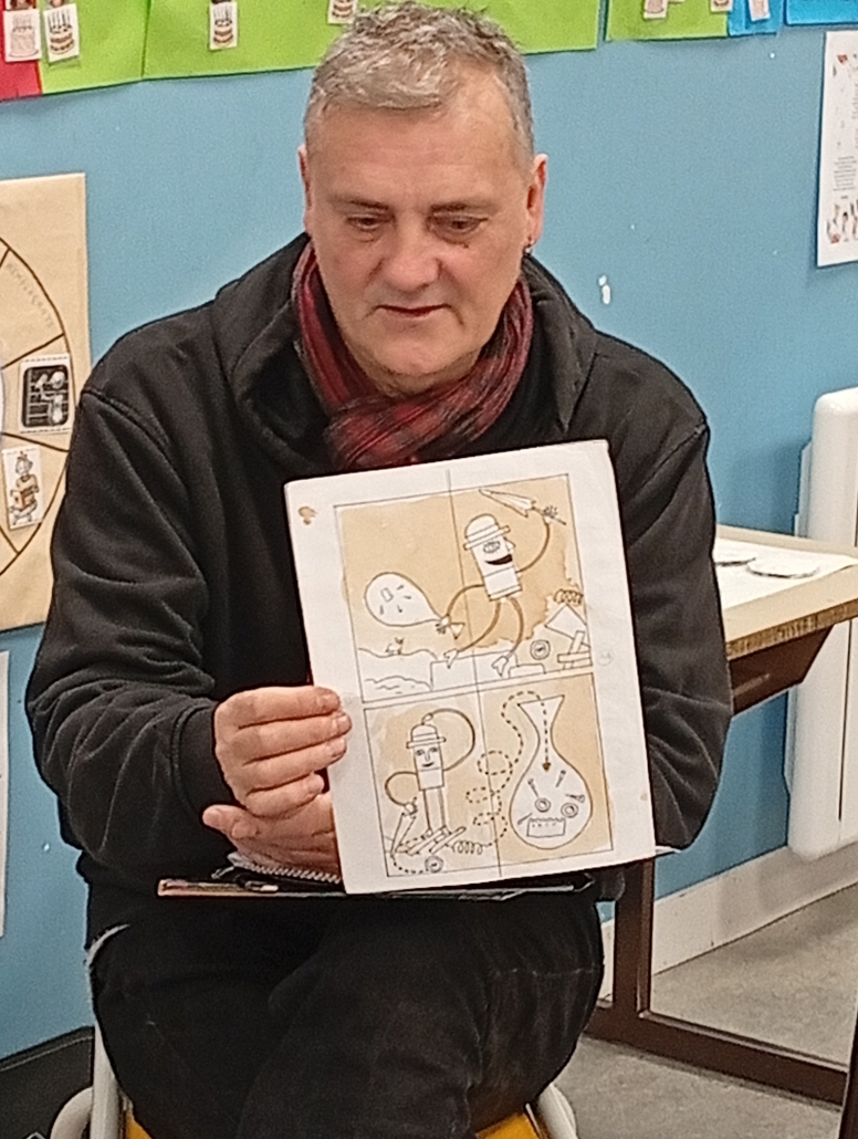 Il nous a parlé du monde de l’édition, des métiers qui gravitent autour d’un livre et des étapes de fabrication. L’illustrateur sympathique et généreux nous a même montré des esquisses de son livre « Elvis » au tout début de son parcours. Nous avons pu écouté et voir en avant première son prochain livre qui n’est pas encore paru ! ! Nous avons écouté et chanté l’île Sandwich, extrait de son livre CD « Li Le La ».