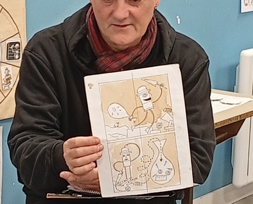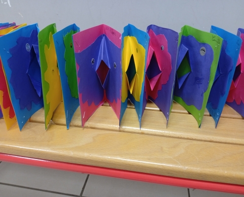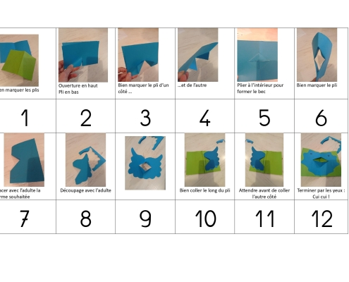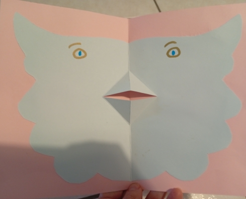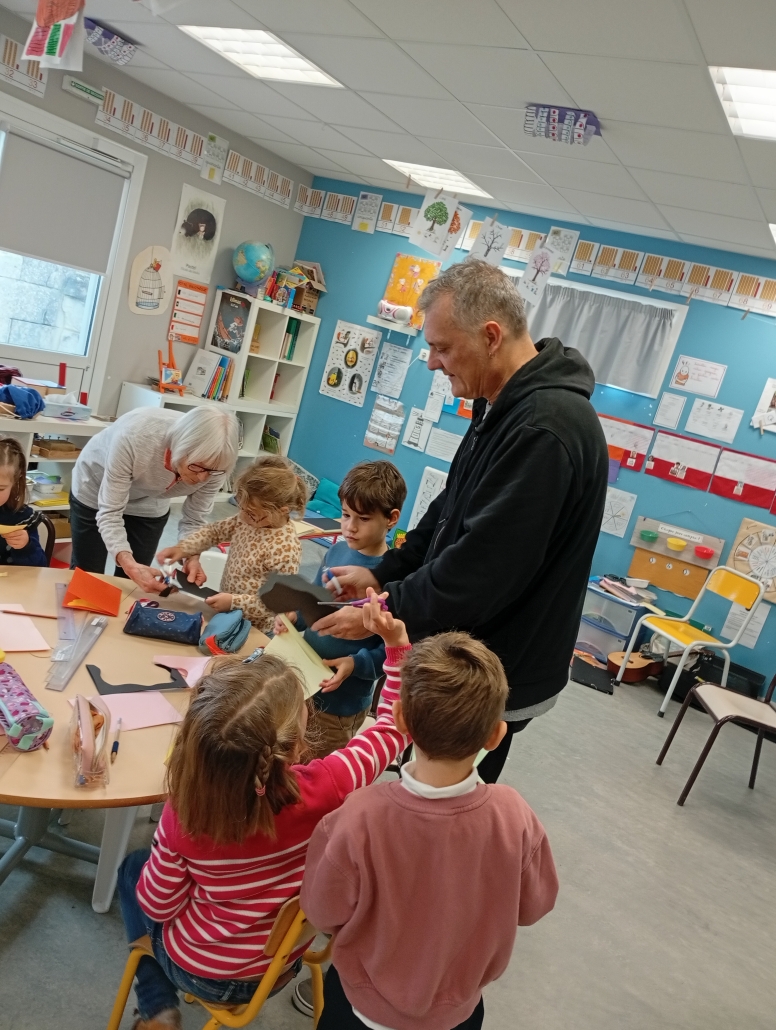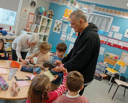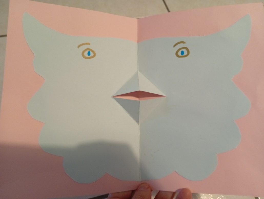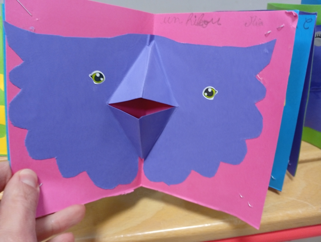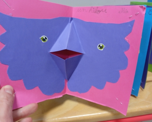 Enfin, nous avons essayé la technique du pop-up, pas à pas, en fabriquant un livre de hiboux ! Avant de partir, il nous a laissé un dessin dédicacé, nous avons pu repartir chacun avec le nôtre.