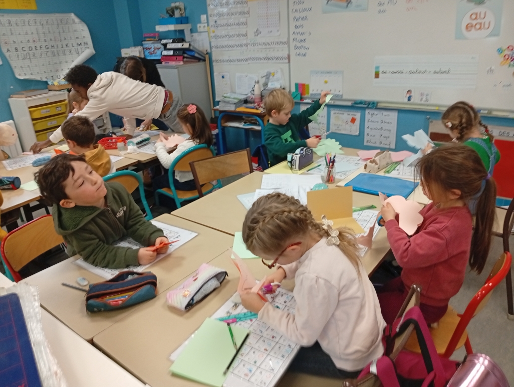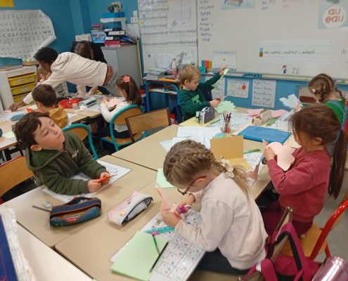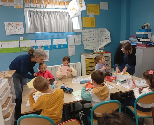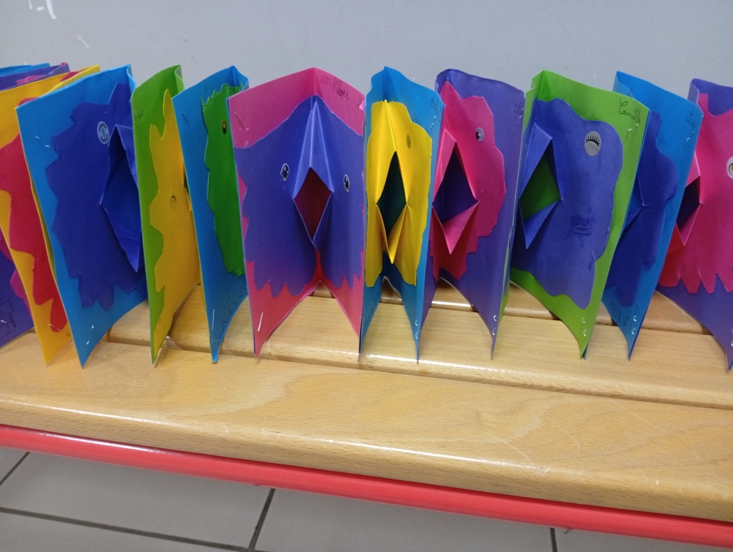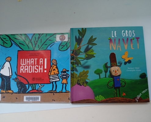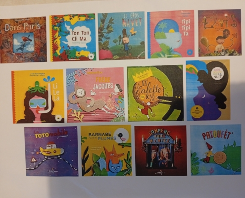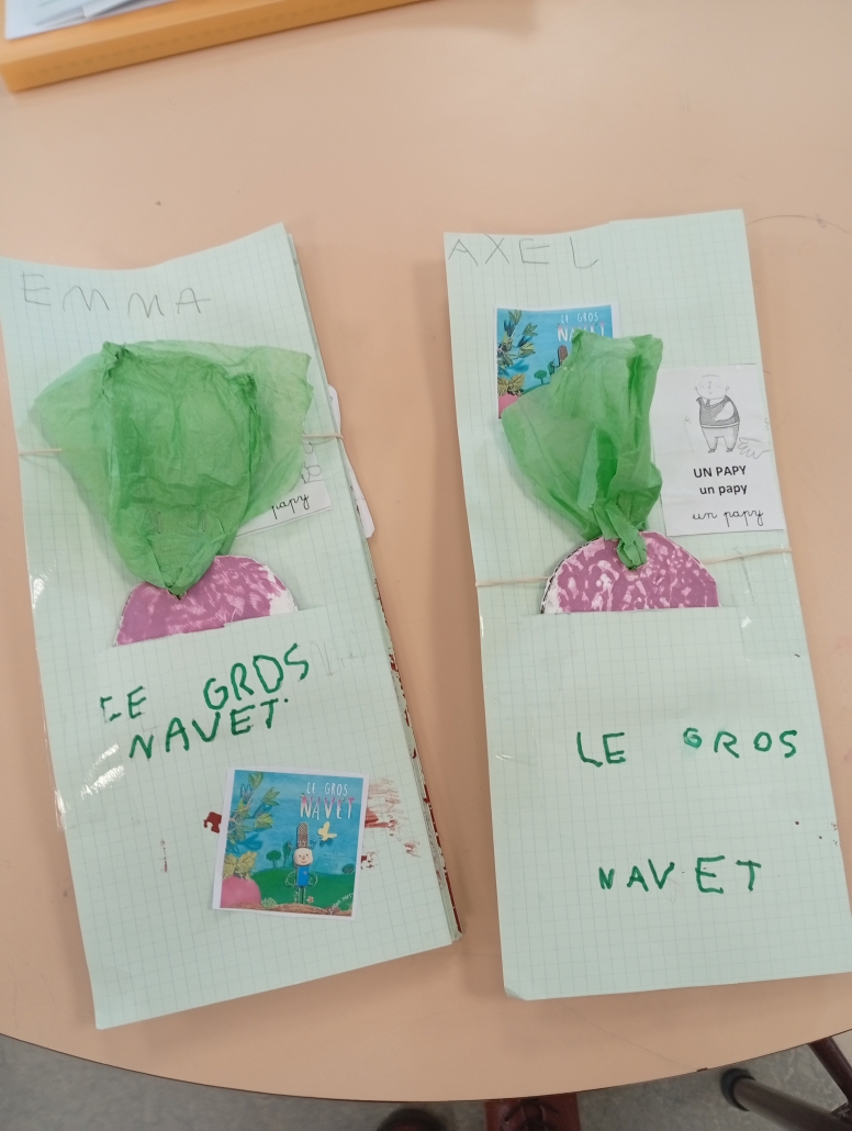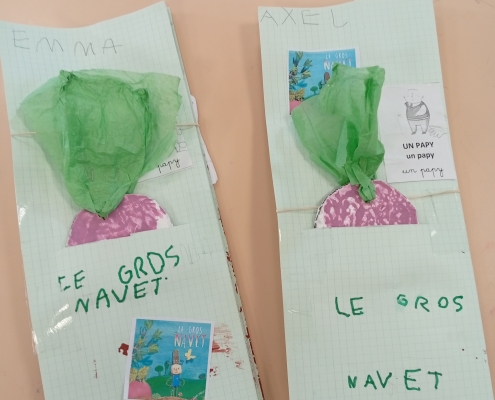 Les GS ont particulièrement travaillé à partir de l’album « le gros navet » afin de rapporter un support à la maison et raconter l’histoire tout seul. Nous avons beaucoup aimé « Barnabé n’a pas de plumes », « La totomobile », « Elvis », « Dans Paris » et « Des papillons dans la nuit » et « Le soleil et la lune » qui met en images la chanson de Charles Trénet.